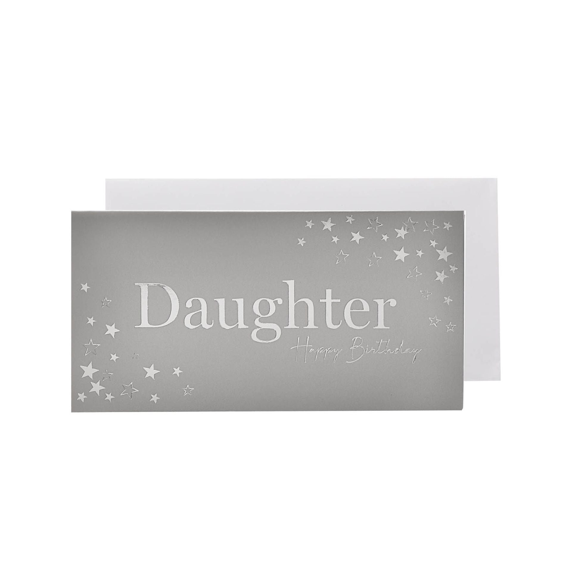 Plicul elegant „Daughter” de la Milestones by CELEBRATIONS® este alegerea ideală pentru a oferi bani, vouchere sau bilete la evenimente într-un mod elegant și plin de stil. Plicul poate insoti elegant un cadou pentru fiică. Ideal pentru majorat, aniversare sau absolvire. Alternativă modernă la plicul clasic, vine cu un finisaj argintiu strălucitor și motive cu steluțe pentru un aspect festiv.
